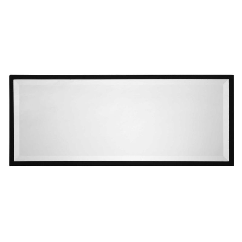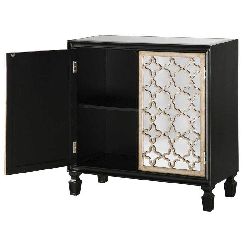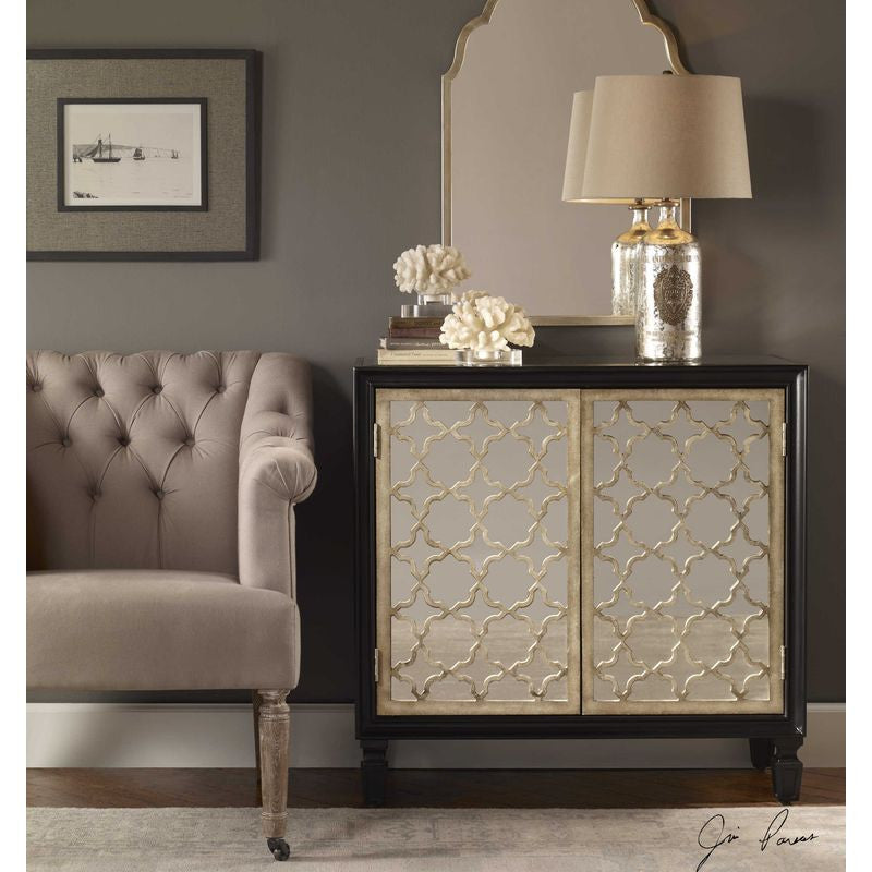 Gloss black wooden case with an interior shelf, featuring mirrored doors inset with an intricately-cut quatrefoil lattice in burnished silver leaf.