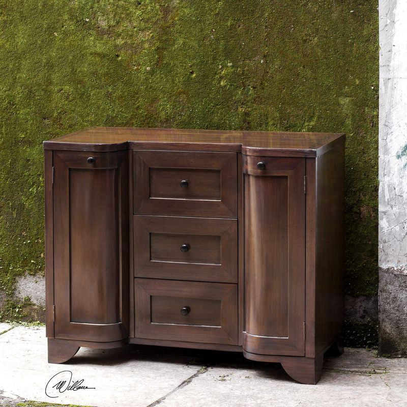 A unique reverse breakfront in a gray flannel finish with warm mahogany undertones, this console features deeply curved cabinet doors, each enclosing two adjustable shelves, and three recessed panel drawers.