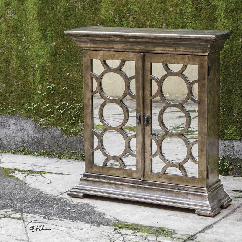 Mahogany wood chest with distressed pewter finish featuring doors in geometric circle design with lightly antiqued mirror background. One adjustable shelf.