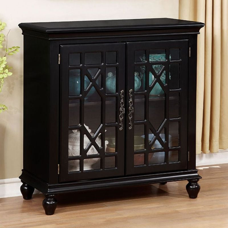 Display some delicate treasures behind the stylized tempered glass cabinets of this storage piece. The beautiful framework comes in two classic colors to create a timeless visual, especially while paired with the antique floral-inspired pulls and bun feet. - Transitional Style - 3mm Tempered Glass Doors - Cabinet w/ 2 Shelves - Antique Floral Handles - Solid Wood/Wood Veneer/Others - Black