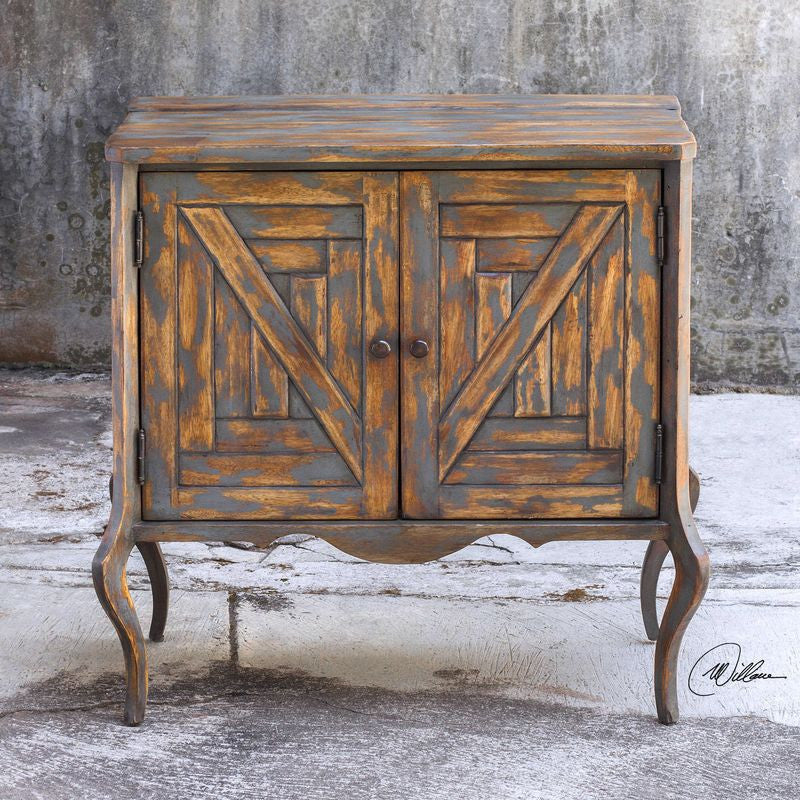 Featuring finely carved, hardwood legs and hand pieced wooden doors, this two door cabinet with an adjustable interior shelf becomes the room accent with its unique, heavily scraped paint finish in soft gray with natural hardwood undertones.