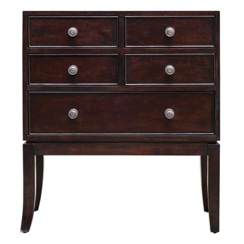 Clean hickory finished mango and albazia wood with antique brass finished drawer pulls.