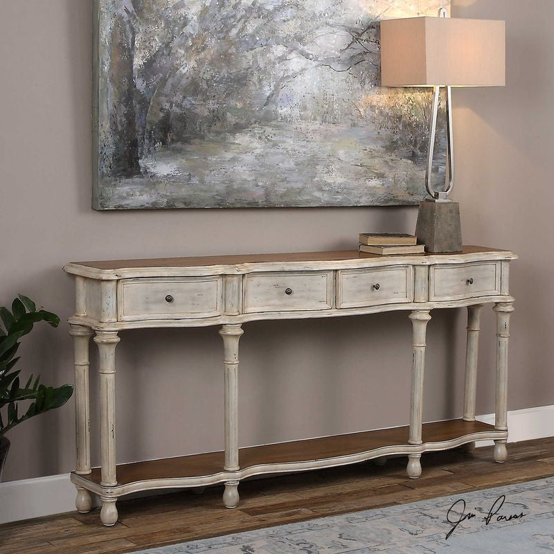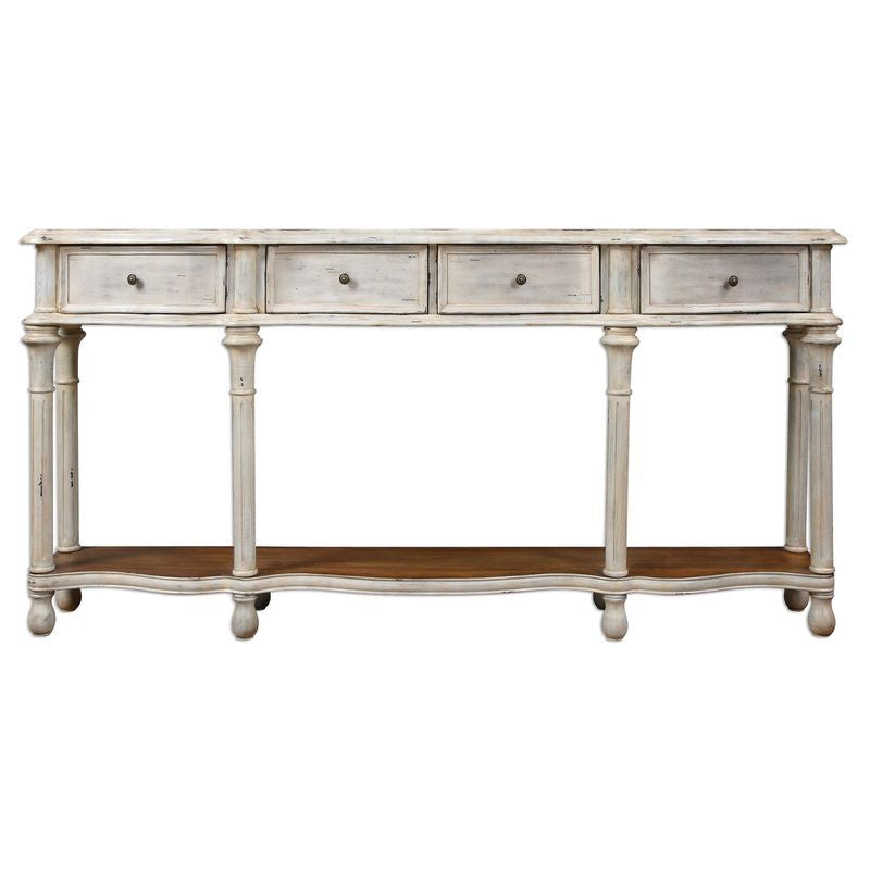 Serpentine console with hand turned columns, finished in lightly distressed off-white with woodgrain undertones. Top and bottom shelves are warm walnut stained pine.