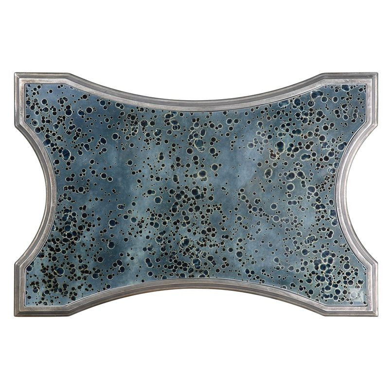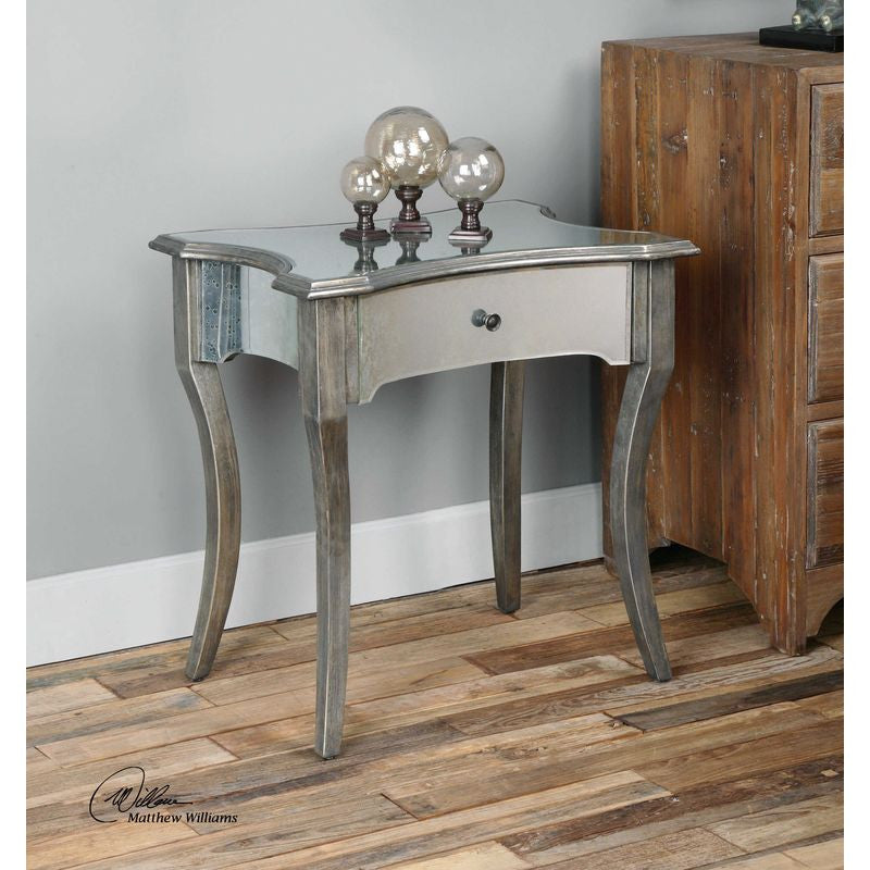 Brushed silver, solid hardwood legs are accented by curved antique mirror on the concave sides and drawer, following the shape of the carved edge, mirrored top.