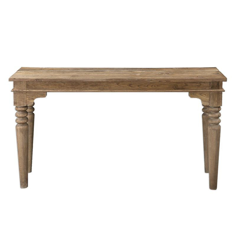 Made from 100% elm wood, with a reclaimed top sanded and minimally finished to highlight the natural grain, distressing, and character of recycled wood. Legs are hand-turned.