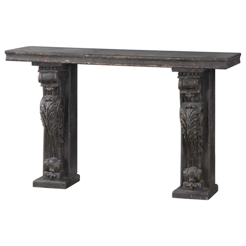Carved acanthus leaf corbel legs and plank top, featuring a gray washed, black stone finish.
