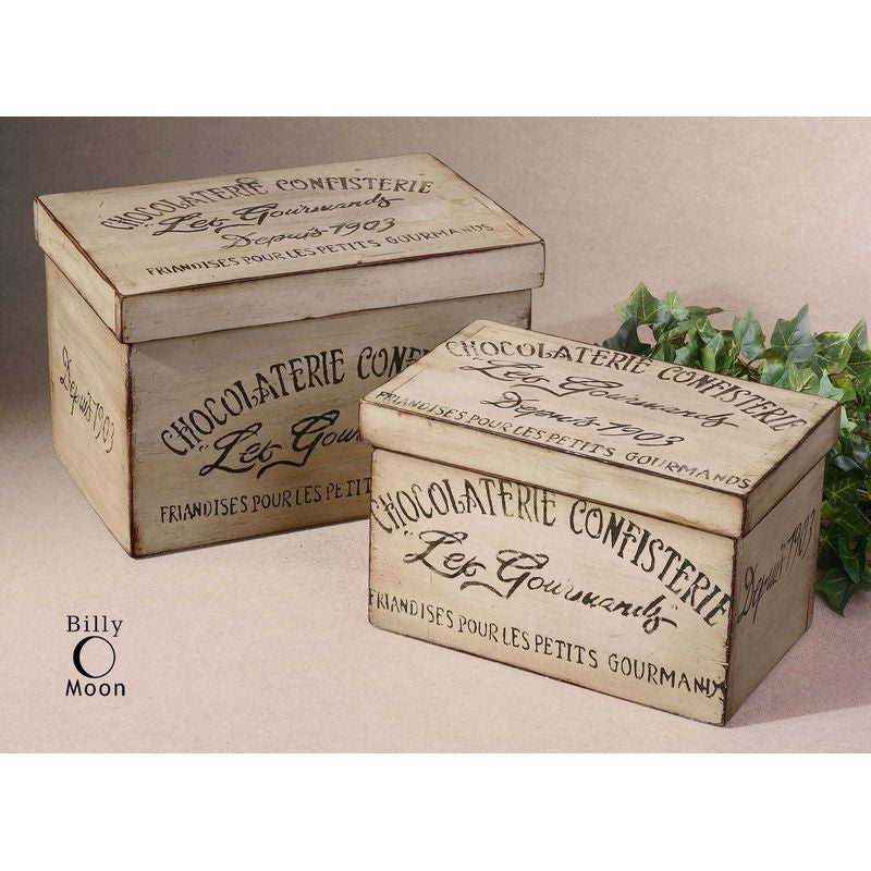 Made of genuine fir wood, these boxes feature a distressed, aged ivory finish with burnished details and black accents. Sizes: sm-10x6x6, lg-12x8x8
