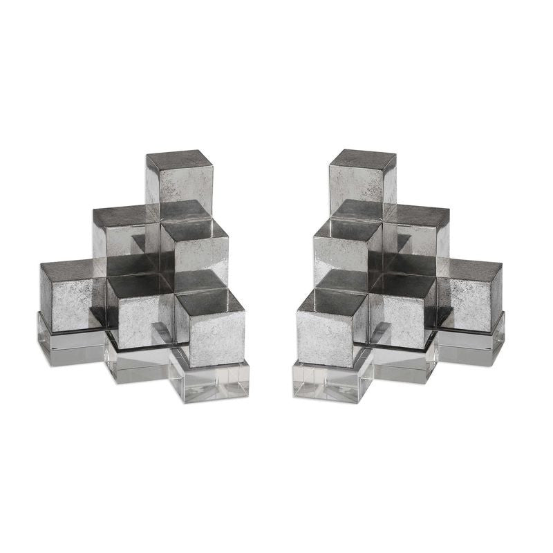 Intriguing, geometric style bookends feature a tarnished silver finish with crystal bases.