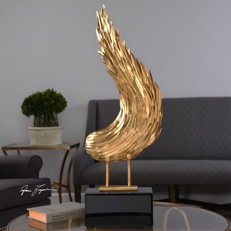This replica of a bird's wing features amazing feather details and is finished in lightly antiqued gold leaf then mounted on a beveled, black glass base.