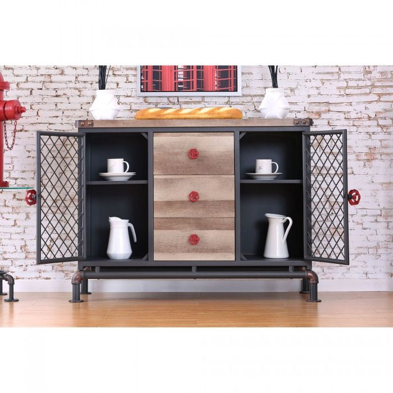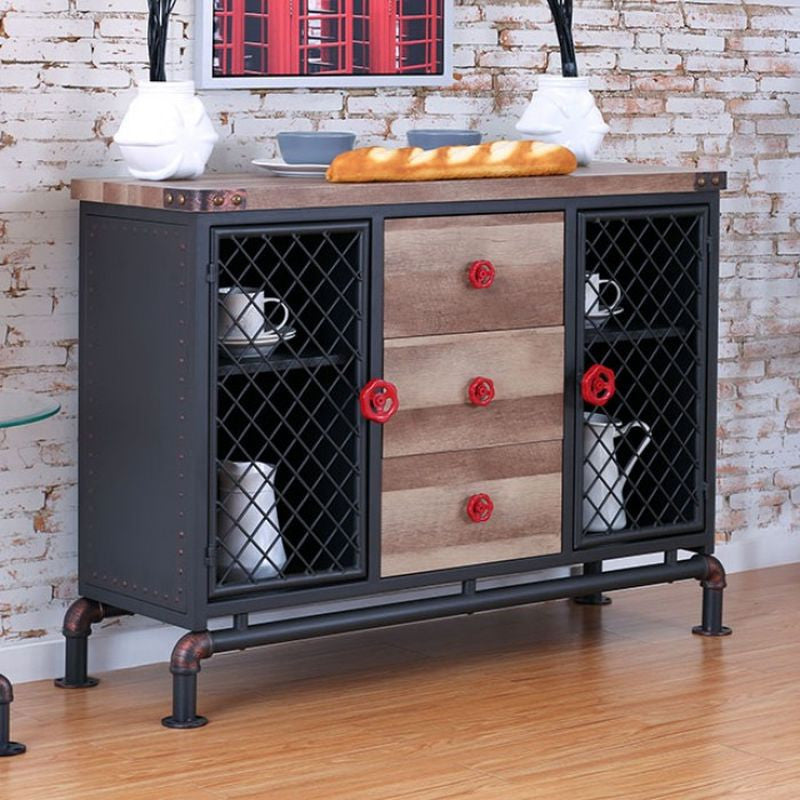 Make your dining room feel like an open and airy retreat with this industrial collection. The pipe inspired table base is finished in antique black with hand-brushed copper details for a rustic touch, while top panels are finished in natural tone. Matching server and wine crack complete add maximized functionality and storage to this unique set. - Industrial Style - Replicated Wood Table Top - Metal Corner Accents - Metal/Others - Natural Tone Finish - Antique Black Frame