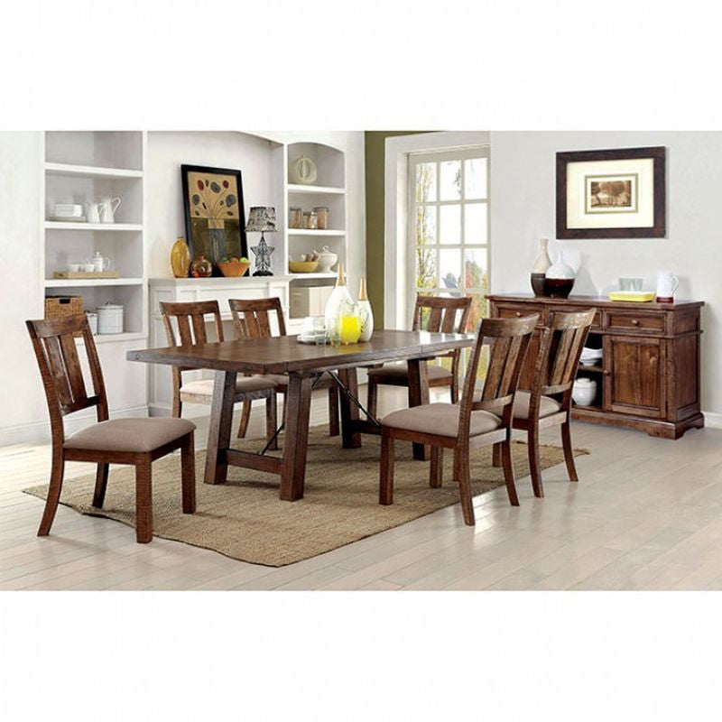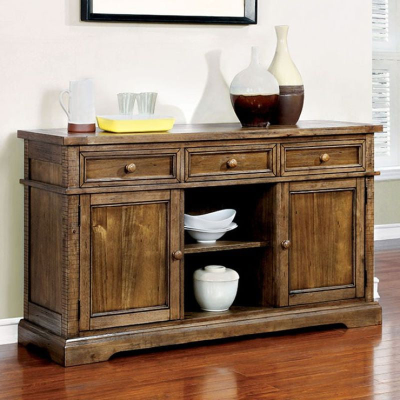 Add natural vibes to your dining area with this wood constructed server featuring realistic indentions that mimic wood features. Great for any homeowner trying to add a bit of flair to their dining area. - Transitional Style - Bold & Sturdy Design - Solid Wood, Wood Veneer, Others - Medium Oak Finish