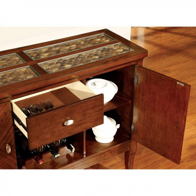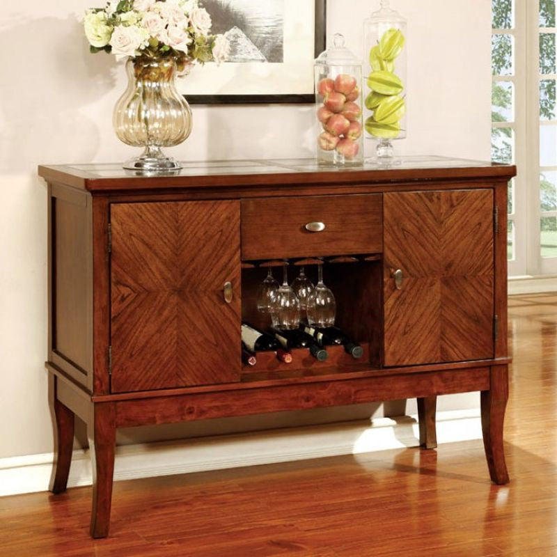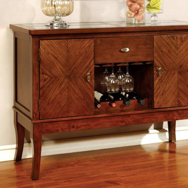 This tranistional style server is elegantly designed and can store all of your dish and glassware. Finished in dark oak. - Transitional Style - Tempered Glass Top - Solid Wood, Wood Veneer & Others - Dark Oak Finish