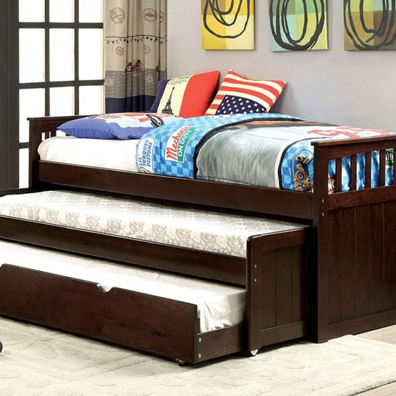 Throw the ultimate slumber party with this espresso finished 3-layer nesting daybed! Have friends or family comfortably tucked in any of the three twin-size sleeping spaces. When it comes time for them to leave, roll the frames back under the daybed and regain valuable floor space. The slatted ends and plank style sides give a charming visual, adding a touch of style to a piece with tons of function. - Country Style - Slatted H/B and F/B - Solid Wood/Wood Veneer/Others - Nesting Design - Optional Twin Trundle - Espresso Finish