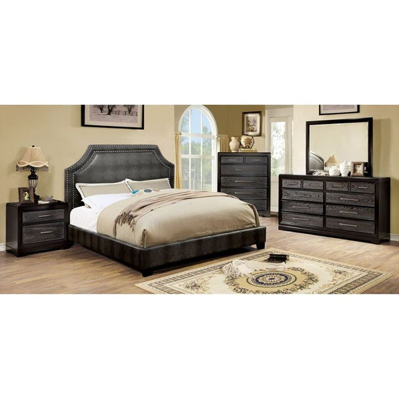 Create sophistication right in your bedroom while showcasing your eccentric taste with the underlying patterning. This fully upholstered platform bed features dual nailhead trim outlines while the crocodile leatherette adds a unique touch. - Contemporary Style - Nailhead Trim - Padded Leatherette Headboard - Solid Wood, Wood Veneer & Others - Crocodile Gray Finish