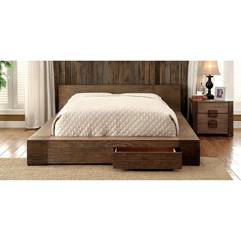 Visually appealing with urban undertones, this wooden collection is perfect for open spaces such as lofts. A low-profile head and base design with natural wood grain patterns create a comfortable appeal, with drawers on the footboard for practical storage. The case goods include wooden block-like pulls that are sure to coordinate well with diverse interior designs. - Transitional Style - Low Profile Bed w/ Modern Low H/B Design - 6 Footboard Styles Available - Felt-lined Top Drawers w/ Square Wooden Pulls - Double Drawer Fronts for Night Stand Bottom Drawer - Slat Kit Included - Solid Wood, Wood Veneer, Others - Rustic Natural Tone Finish