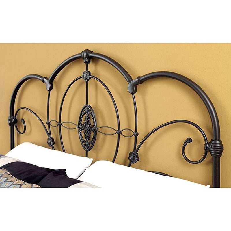 Add an enchanting atmosphere to any bedroom with this stylized metal bed. The lifted structure showcases a matching headboard and footboard with arched tubing and ornate scroll detailing. Metal construction ensures this bed stays durable and steady while smooth powder coating preserves the classic color. - Contemporary Style - Scalloped Headboard & Footboard - Scrolling Detail - Sturdy Metal Construction - Black