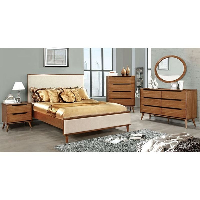 For a quick modern update to your home, this collection will add that trendy mid-century appeal. Featuring a oak finish, this padded fabric panel bed is complete in a platform style with an included mattress ready slat kit. Coordinating case goods boast slim flared legs and recessed handle drawer pulls. A choice of oval or rectangular wall mountable mirror completes this set. - Mid-Century Modern Style - Round Tapered Legs - Fabric Headboard - Recessed Drawer Handles - Standalone Oval Mirror - Solid Wood/Wood Veneer/Others - Oak Finish