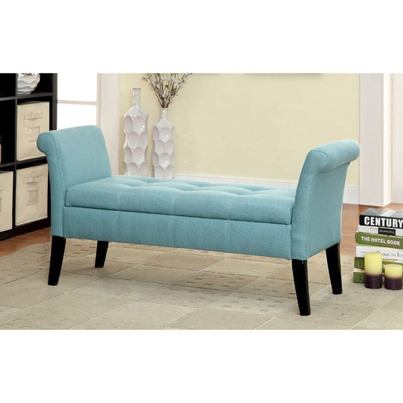 Elegant and minimal design defines this beautiful tufted fabric bench with curved arms and under-seat storage. Seven colors available. - Contemporary Style - Fabric Storage Bench - Curved Arms & Legs - Available in 7 Colors