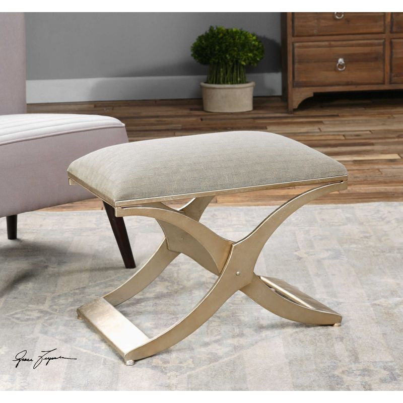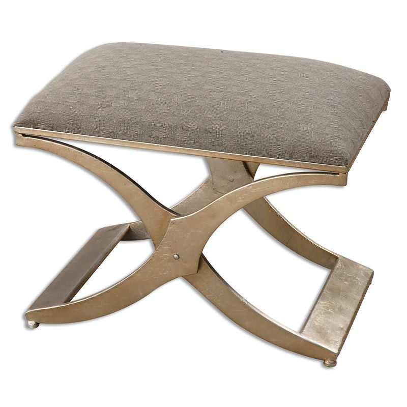 Champagne silver leaf metal frame with a modern industrial feel, cushioned in a silvery gray, patterned canvas seat.