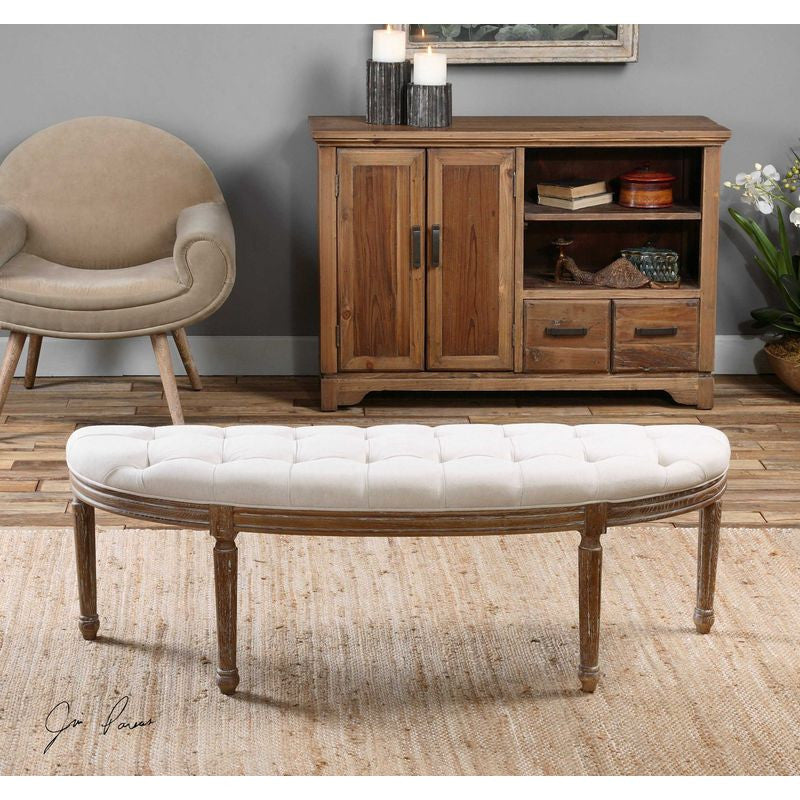 Light and soft, off-white linen and cotton blend in plush button tufts on a weathered oak carved base.