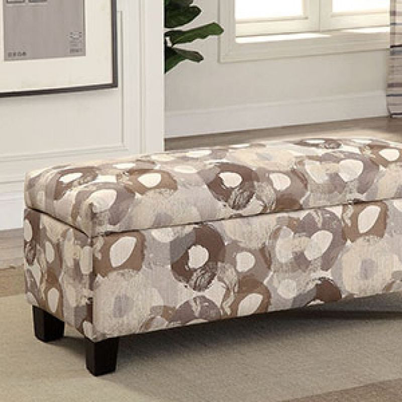 Liven up your living room with this versatile bench. Utilize it as a storage space for magazines and books or use it as a footrest after a long, tiring work day. - Transitional Style - Underseat Storage - Linen-Like Fabric - Beige w/ Pattern