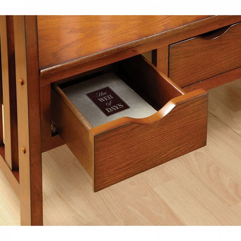 A perfect accent piece for a hallway or entry way. Classic Mission styling with a simple lattice design, straight square legs and arms and roomy drawers for storage under the bench. - Mission Style - Solid Wood, Others - 3 Under-Seat Drawers - Square Legs - Oak Finish