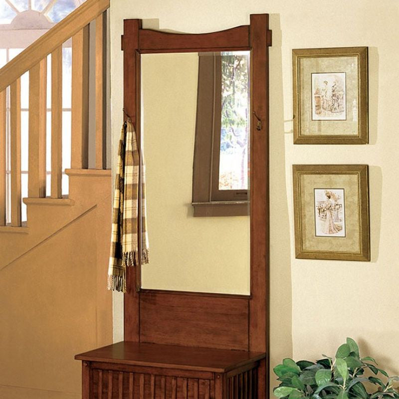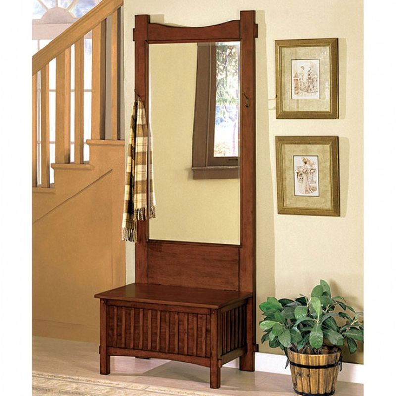 Let this Mission style hallway mirrored bench provide a warm welcome in your entryway. Roomy storage and solid wood construction are added bonuses to this functional piece. - Mission Style - Solid Wood, Others - Under-Seat Storage - Antique Oak Finish