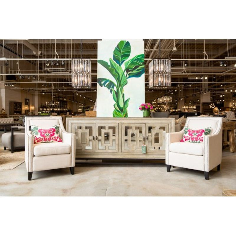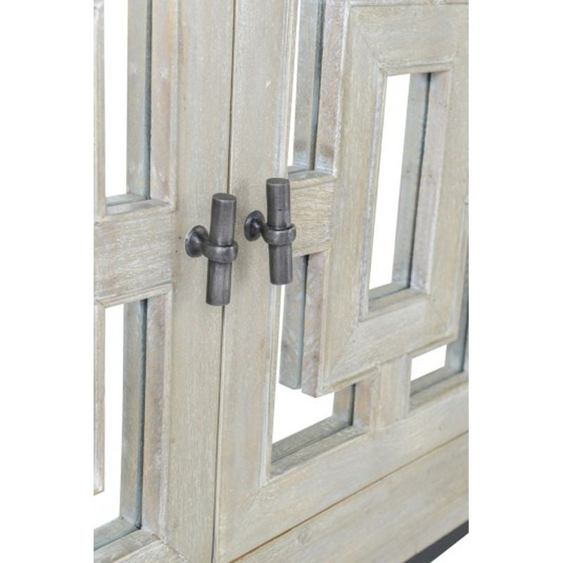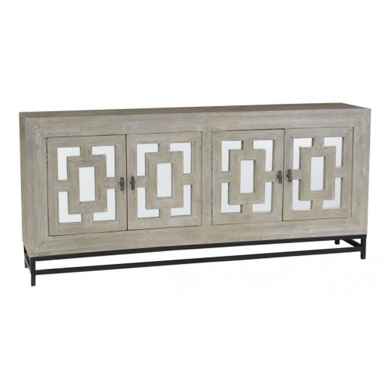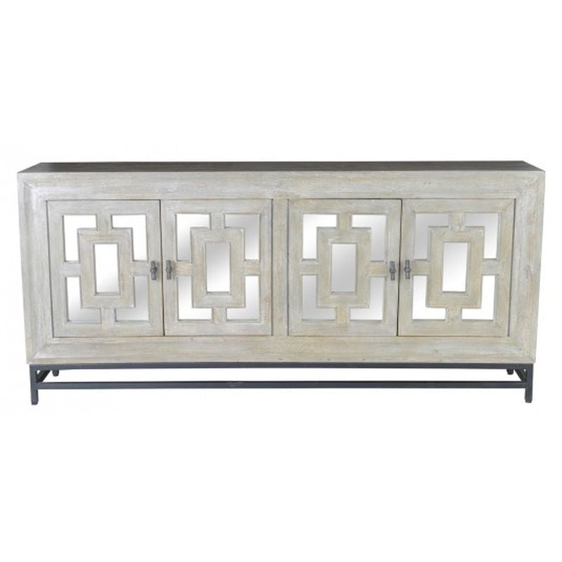 Artemis 4 Dr Sideboard - 76W x 16D x 36H, Mango Wood, Iron, Mirror/Iron accents, Shelves included, Fixed shelves, Hand finished distressed finish, Solid wood construction, Transitional