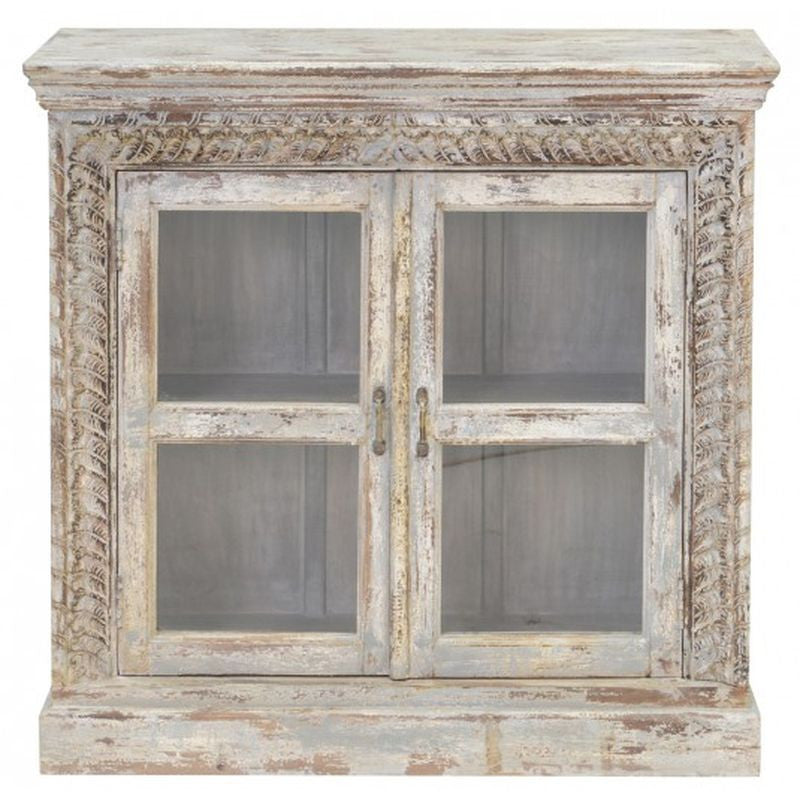 Sebastian 2Dr Sideboard - 39W x 13D x 38H, Mango Wood, Glass Doors, Shelves Included, Fixed Shelves, Antiqued Finish, Solid Wood Construction, Hand Carved, Transitional