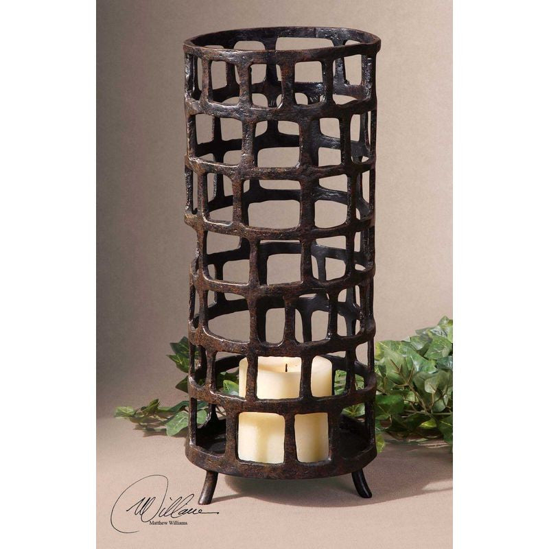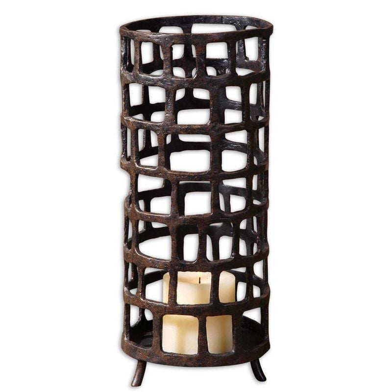 Hand forged metal finished in distressed, aged black with rust brown undertones. Beige candle included.