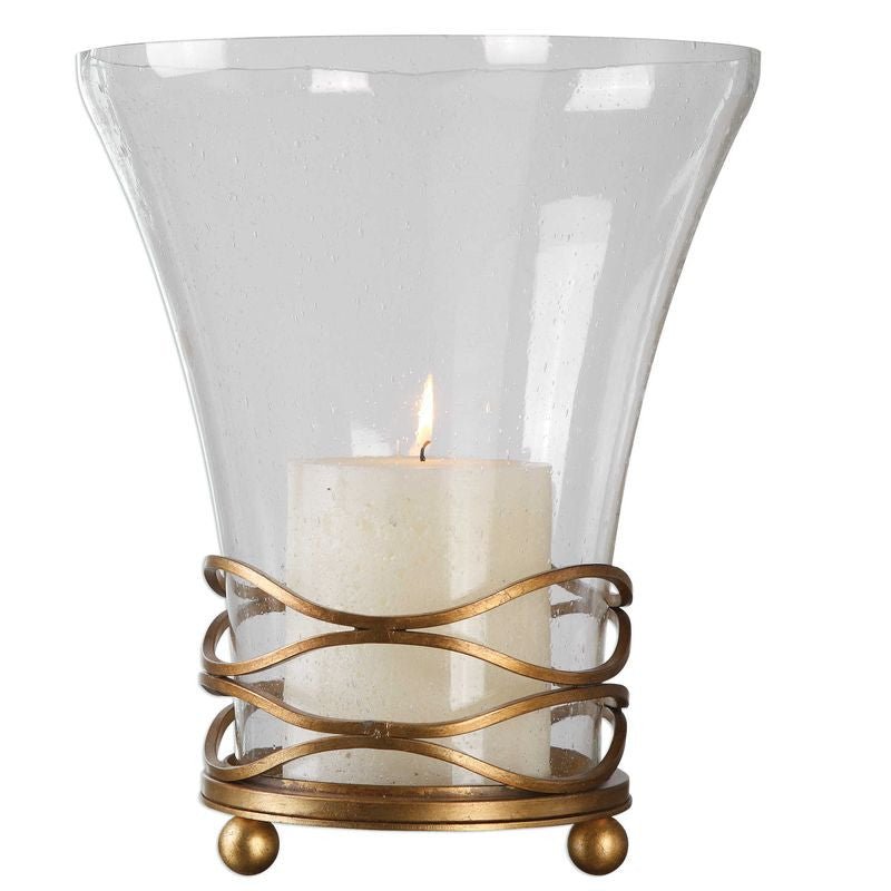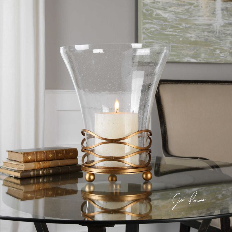 Open weaved, steel finished in a beautiful gold leaf accented by a clear glass globe with air bubbles seeded throughout. Distressed, 5x6 beige candle included.