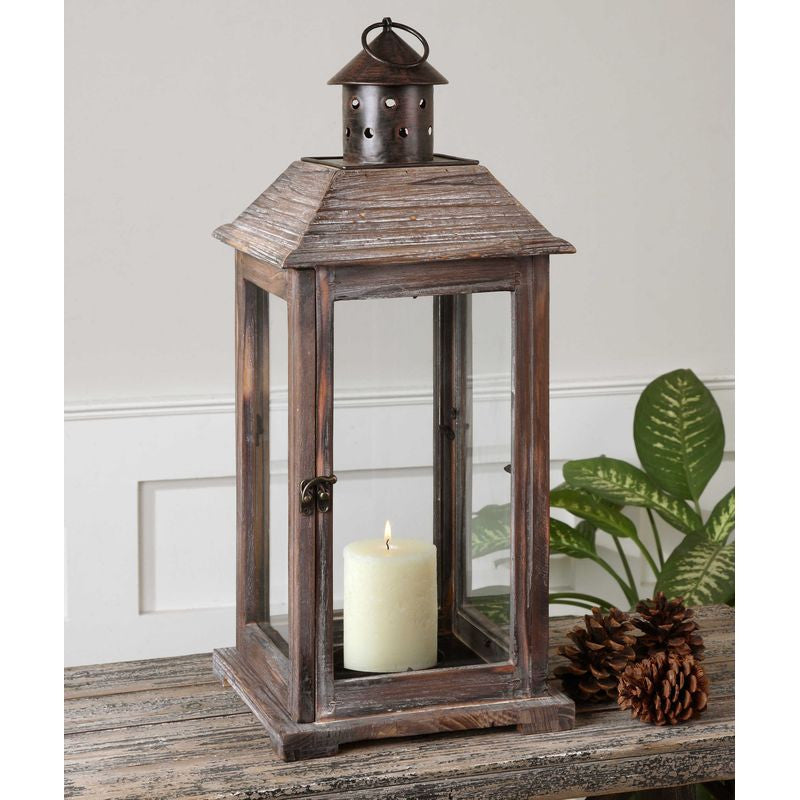 Decorative, old world style lantern made of weathered wood with bronze metal accents. Distressed beige candle included.