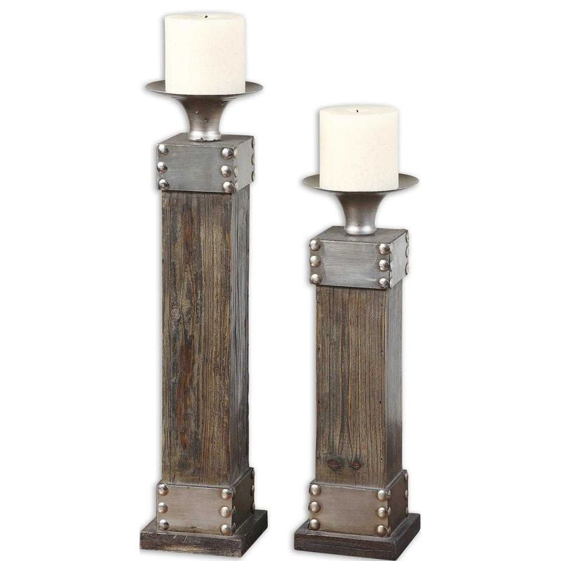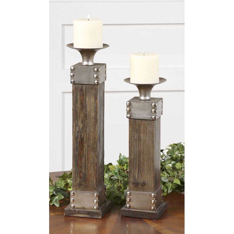 Natural wood with a light chestnut stain and antiqued silver accents. Distressed white candle included. Sizes: sm-5x14x5, lg-5x18x5.