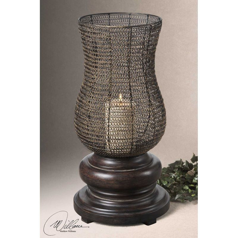 This statuesque candleholder features a heavily distressed, chestnut brown base with a woven metal globe finished in antiqued gold leaf. Distressed beige candle included.