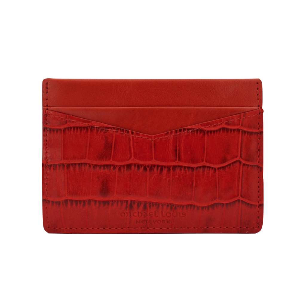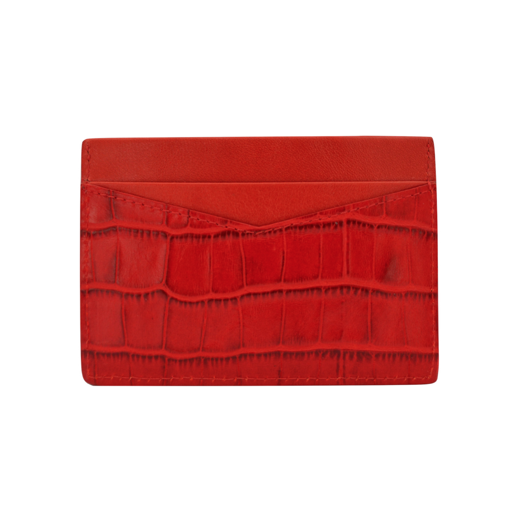Card holder crafted in croc embossed calfskin with tonal leather, 4 card slots, 1 center compartment, blind debossed logo. Handcrafted in New York.