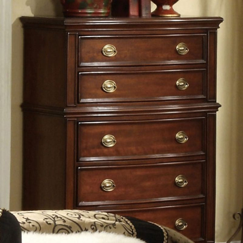 Decorative and traditional styling are accented with classic silver toned hardware. This chest is finished in dark cherry for a regal look. - Traditional Style - Antique Gold Knobs - Solid Wood, Wood Veneer, Others - Dark Cherry Finish