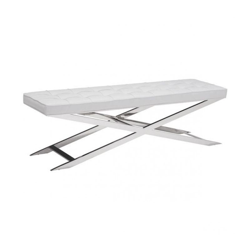 Classic Modern sophistication as the rectangular cross base in solid stainless steel bench supports a plush seat, featuring soft leatherette button tufted upholstery. Color options are white or grey leatherette.