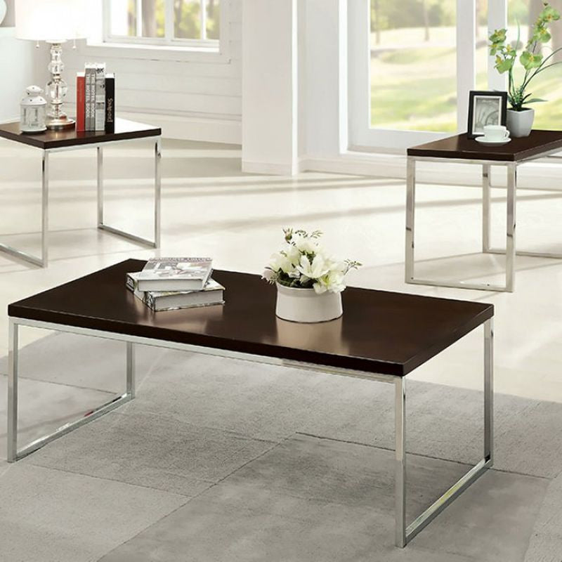 For those who enjoy minimalism, this simple yet sleek coffee table set is for you. The wooden top is finished in espresso. - Contemporary Style - Chrome Legs - Minimalist Design - Espresso Finish