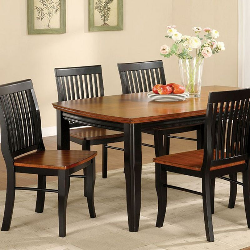 Simple Mission styling and an attractive two-tone design make this set a perfect fit for dining room or kitchen. Finished in antique black and oak, the rectangular table seats six comfortably. The side chairs have wide wooden seats and Mission style backs. - Mission Style - 2-Tone Design - Solid Wood, Wood Veneer, Others - Antique Oak & Black Finish