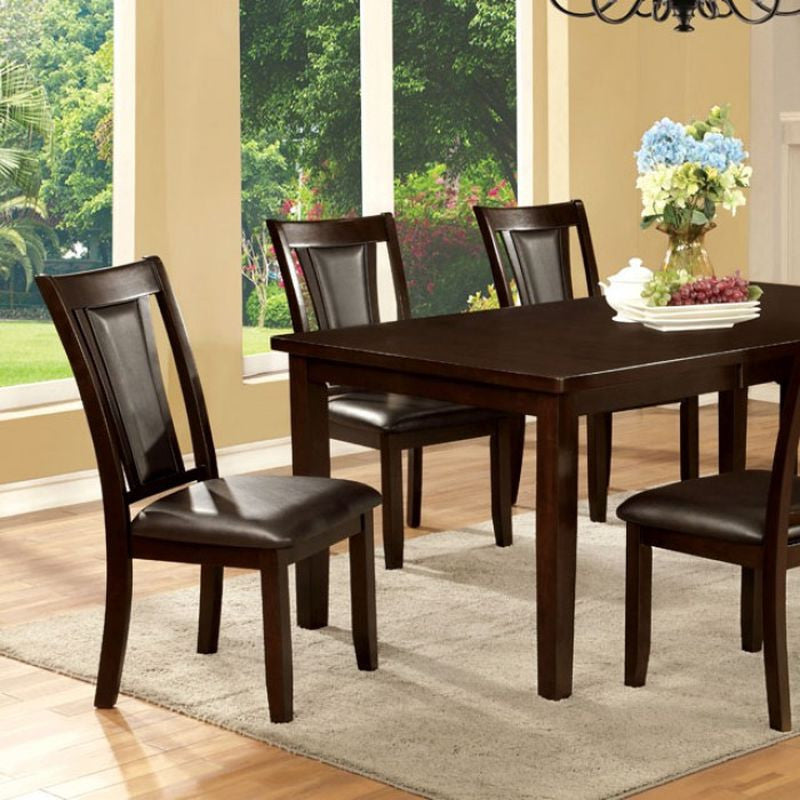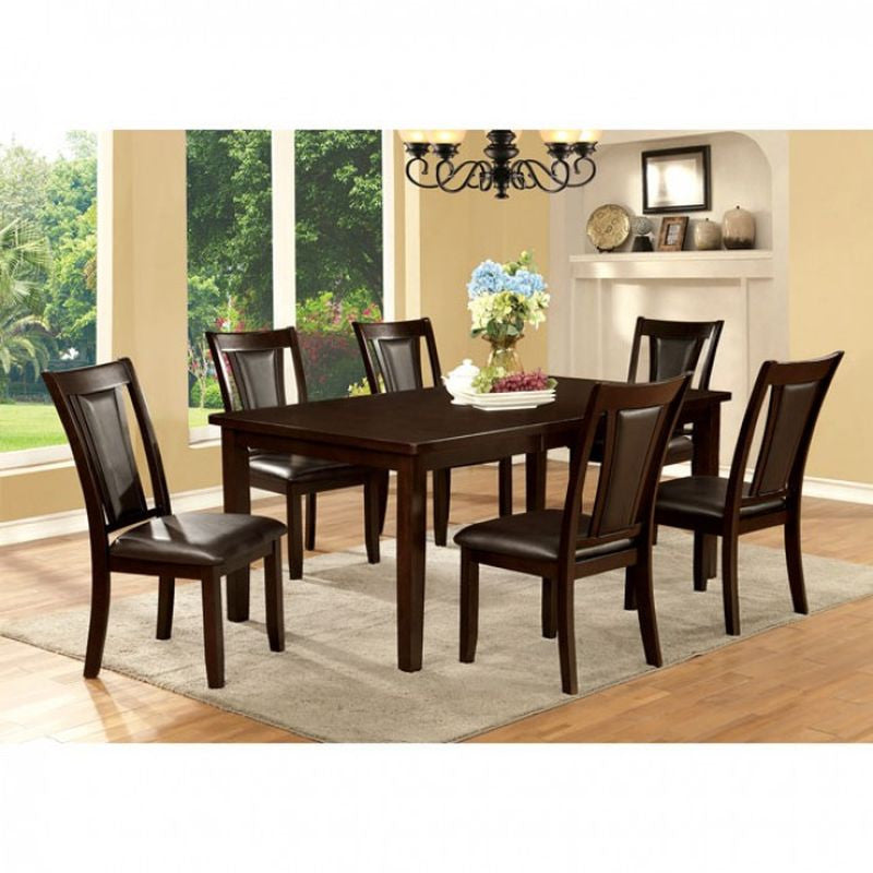 A contemporary dining piece, this table features a rectangular tabletop with an 18-inch expandable leaf. The side chairs complement perfectly, with their padded leatherette seats and backs. - Contemporary Style - 18"Expandable Leaf - Padded Leatherette Seat - Solid Wood, Wood Veneer & Others - Dark Cherry Finish