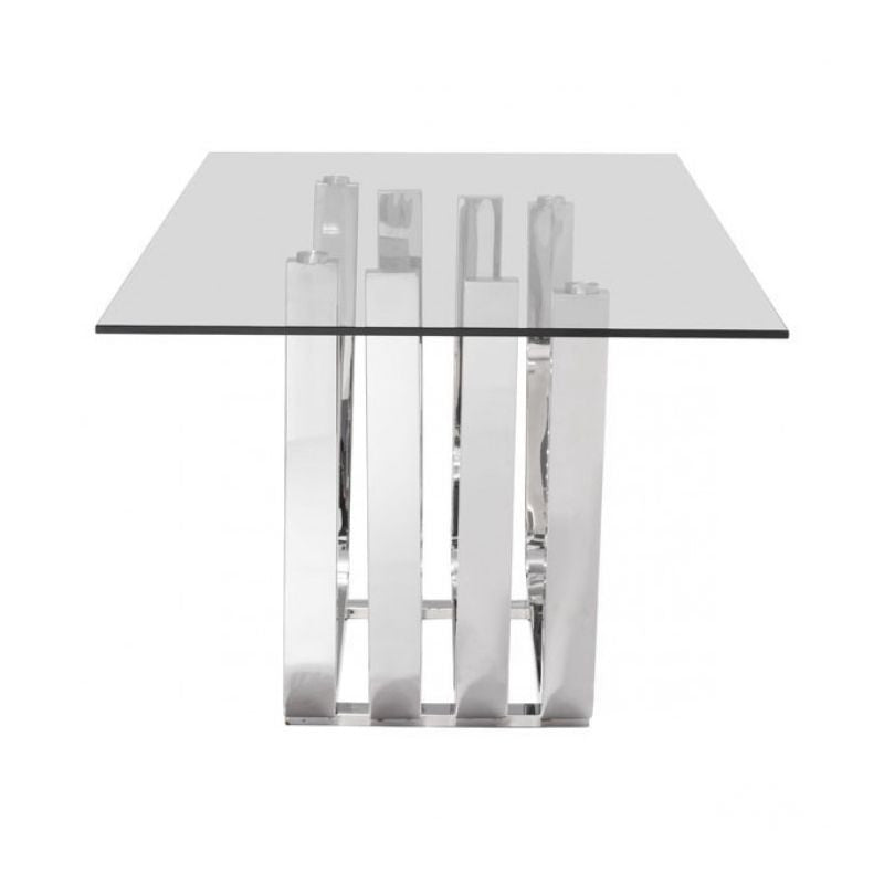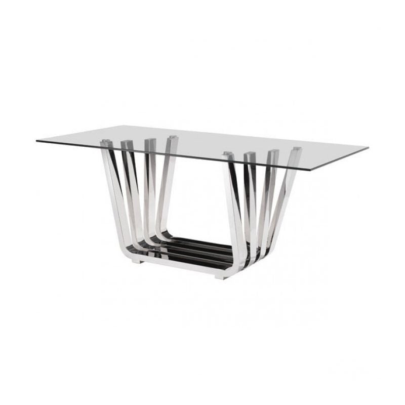 Dine in a world of elegance and simplicity with our Fan dining table featuring slim stainless steel layer-stem design supporting clear rectangular tempered glass top. Perfect for formal home, office conference rooms or commerical applications.