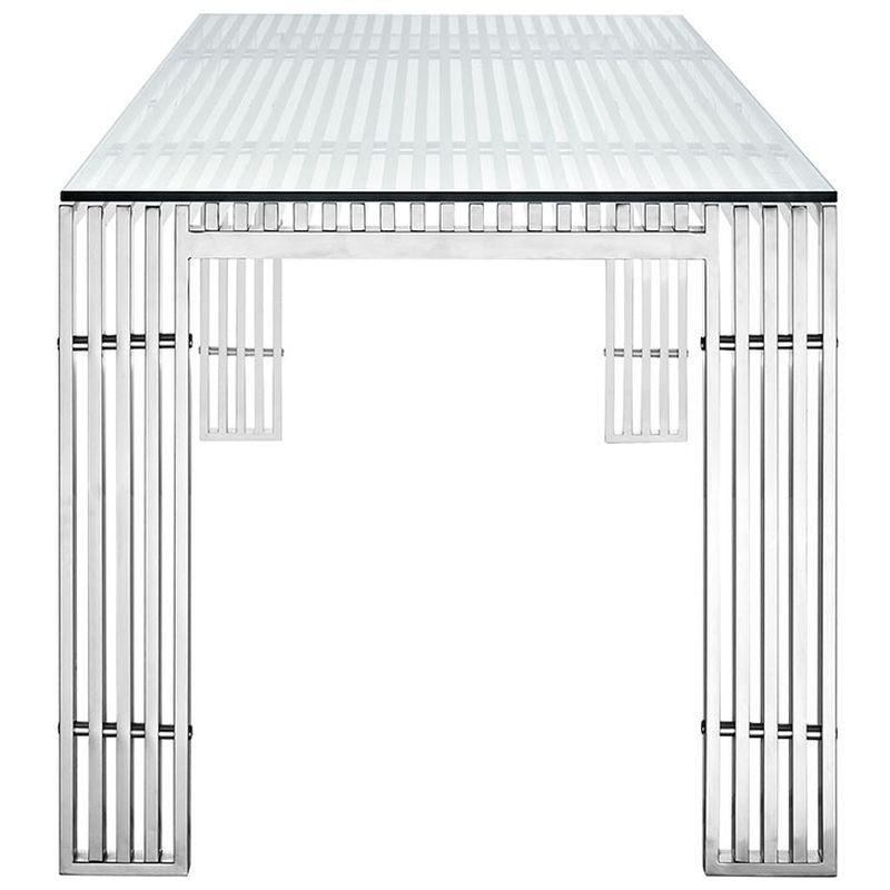 The conduit design of this Gridiron series installment artfully blends stainless steel tubing with a tempered glass table top. Modernism used to be about extremes. Wild shapes and patterns that don’t dare resemble its predecessors. We’ve reached an age of maturity of sorts. We appreciate style, but all the more, we respect those designs that represent a blending of cultures. The Gridiron stainless steel dining table is famous not for its radical shape, but for the strategic transcendence that it provides.