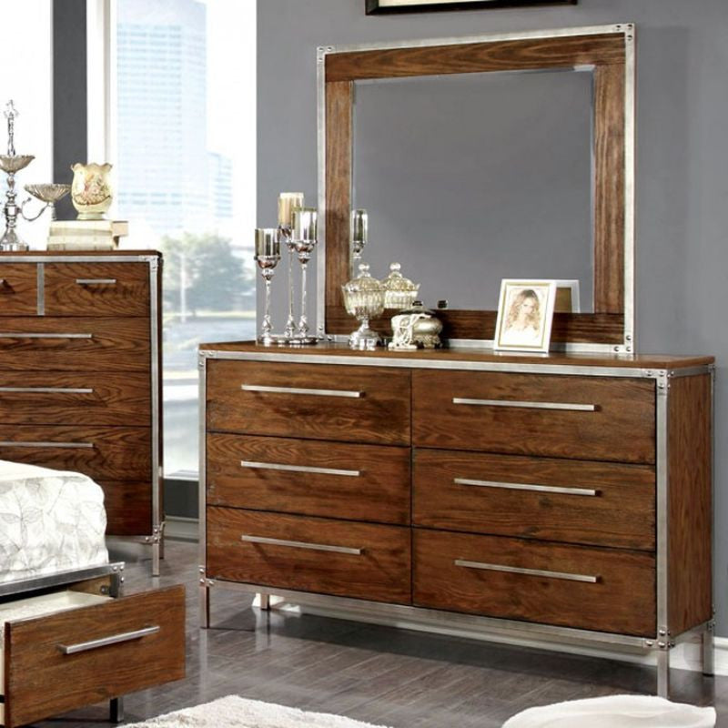 Bring an industrial appeal to your bedroom. Textures along each panel is strongly emphasized with silver finished metal, creating a mixture of rustic and contemporary touches. - Industrial Style - Full Extension Drawers - Felt-Lined Top Drawers - Solid Wood, Wood Veneer & Others - Dark Oak Finish