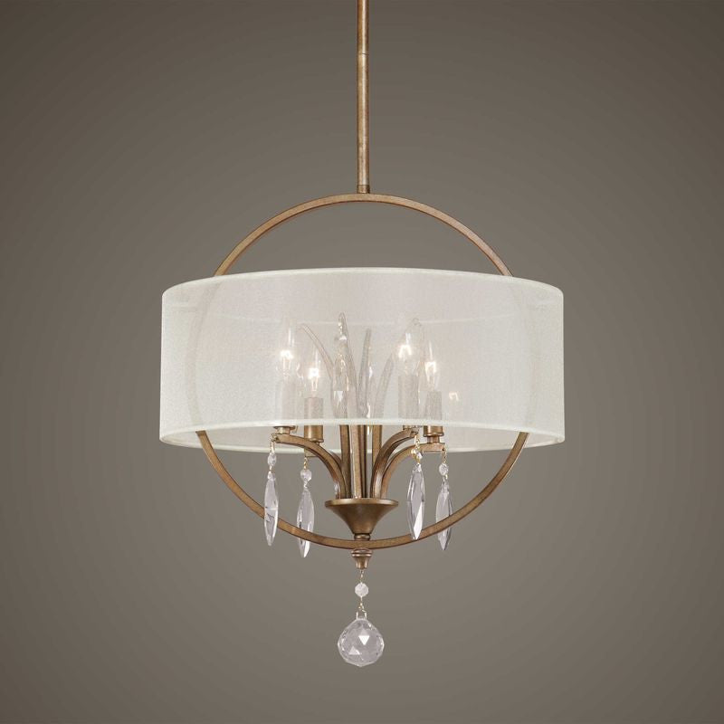 Burnished gold metal with golden teak crystal leaves and a silken champagne sheer fabric shade.