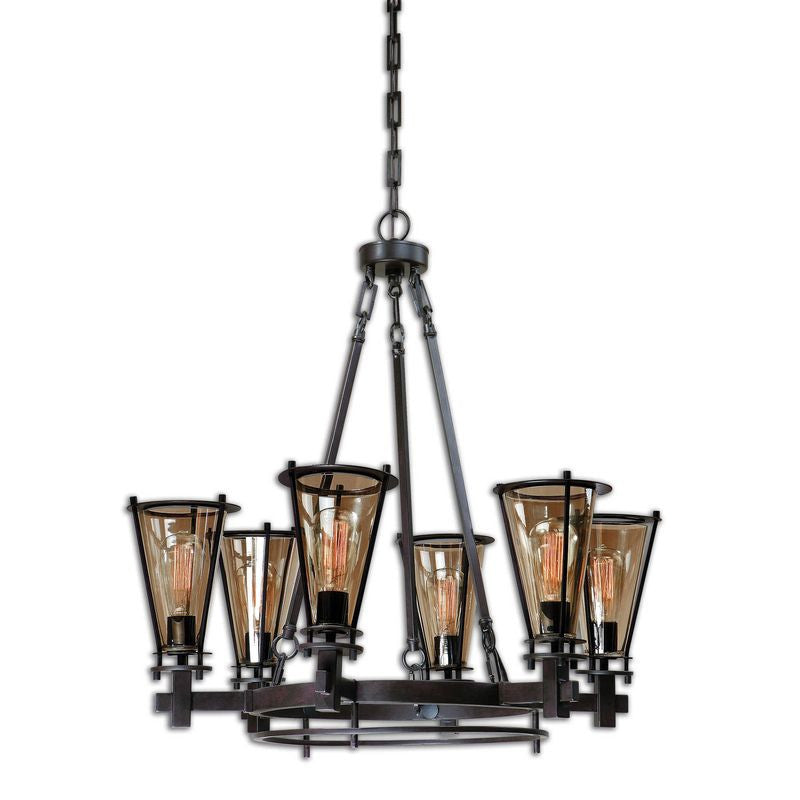 With strong structural lines this look can blend into everything from transitional interiors to classic prairie looks. Plated cognac tinted glass accented with rustic black metal details. 60 watt antiqued style bulbs included.