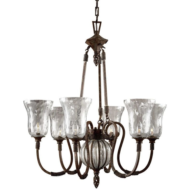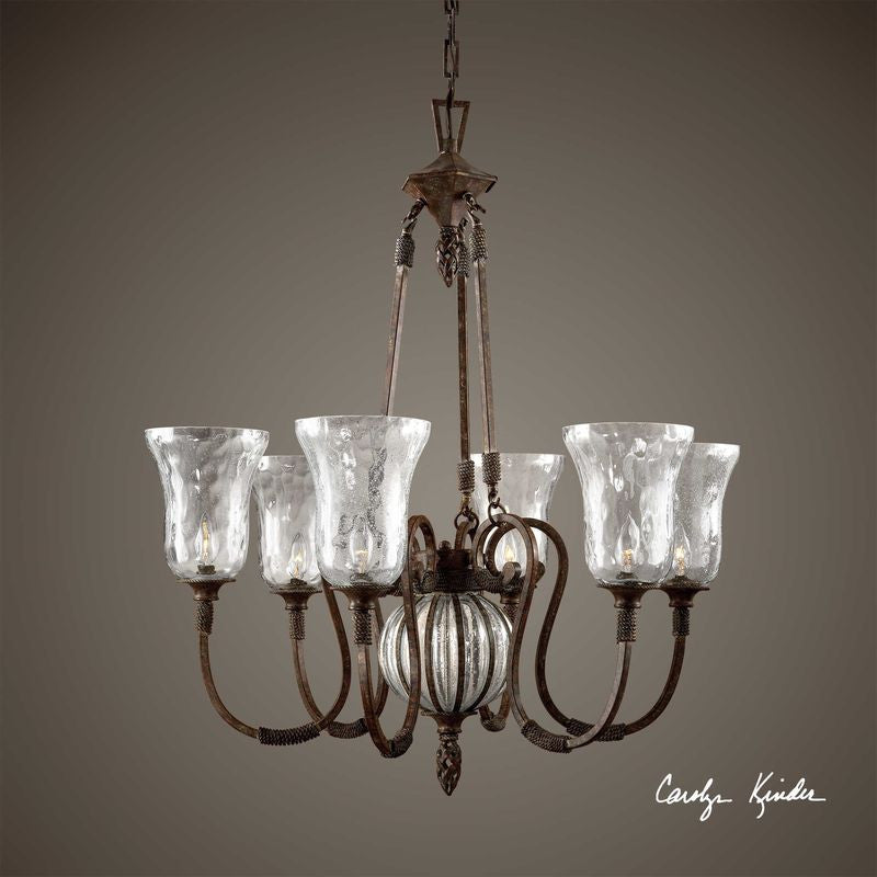 Mouth blown glass banded and structured with iron, and trimmed with rope and open weave touches, then finished with clay patinas to make this casually elegant lighting a statement piece wherever it's used.
