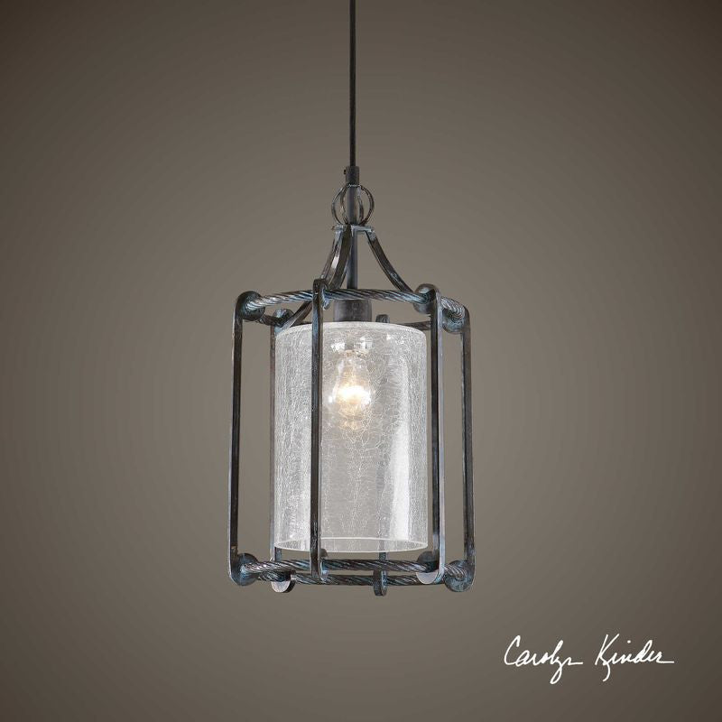 Refreshing turquoise washed rust black finish on a sturdy forged metal lantern shaped pendant. Clear crackle glass shade diffuses the light for an inviting look. 60 watt antique style tubular bulb included.