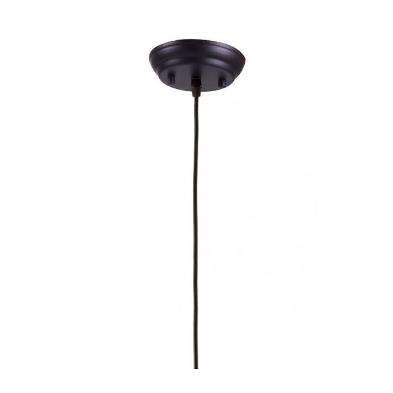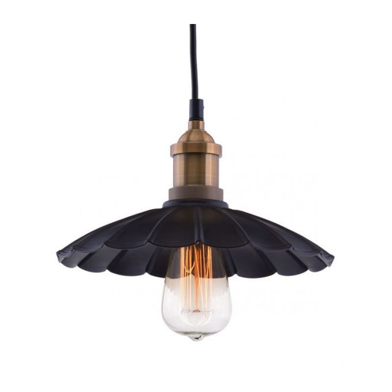 Hamilton Celing lamp has a vintage style Edison bulb, unique metal shade in an antique black finish. Metal shade has a unbrella quality accented by copper metal fitting and hangs from a slim black cord.