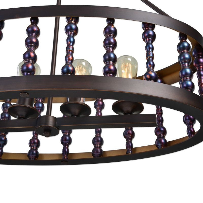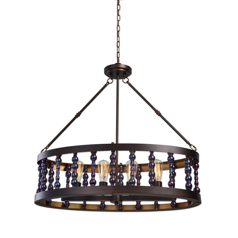 Unique metallic drip glaze is featured on the decorative spindles that make up this oval chandelier. Includes 4-60w ST64 antique decorative bulbs.