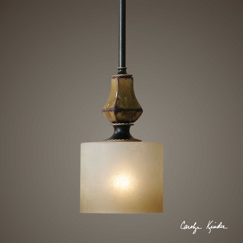 Distressed ceramic finished in a rust green glaze with brushed oil rubbed bronze metal details and a frosted glass shade.